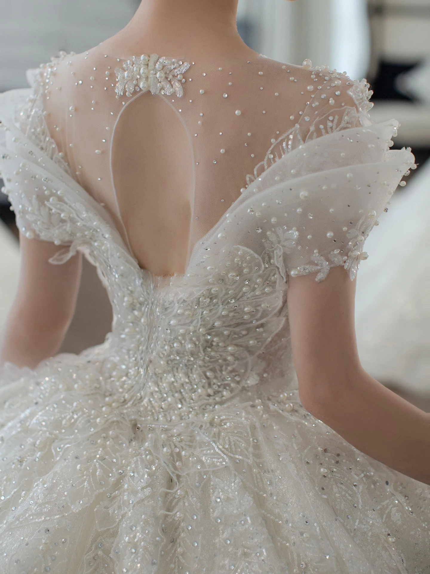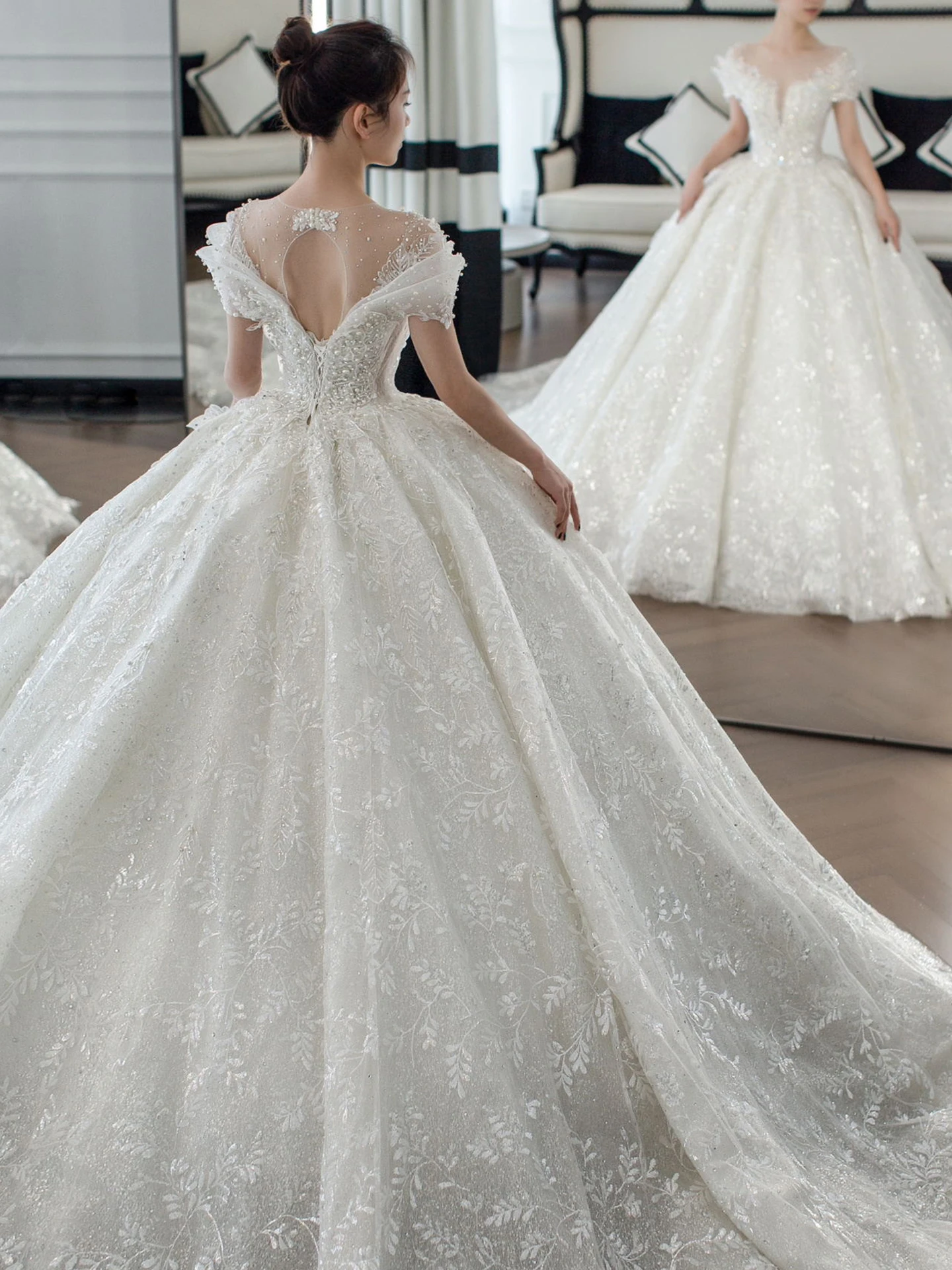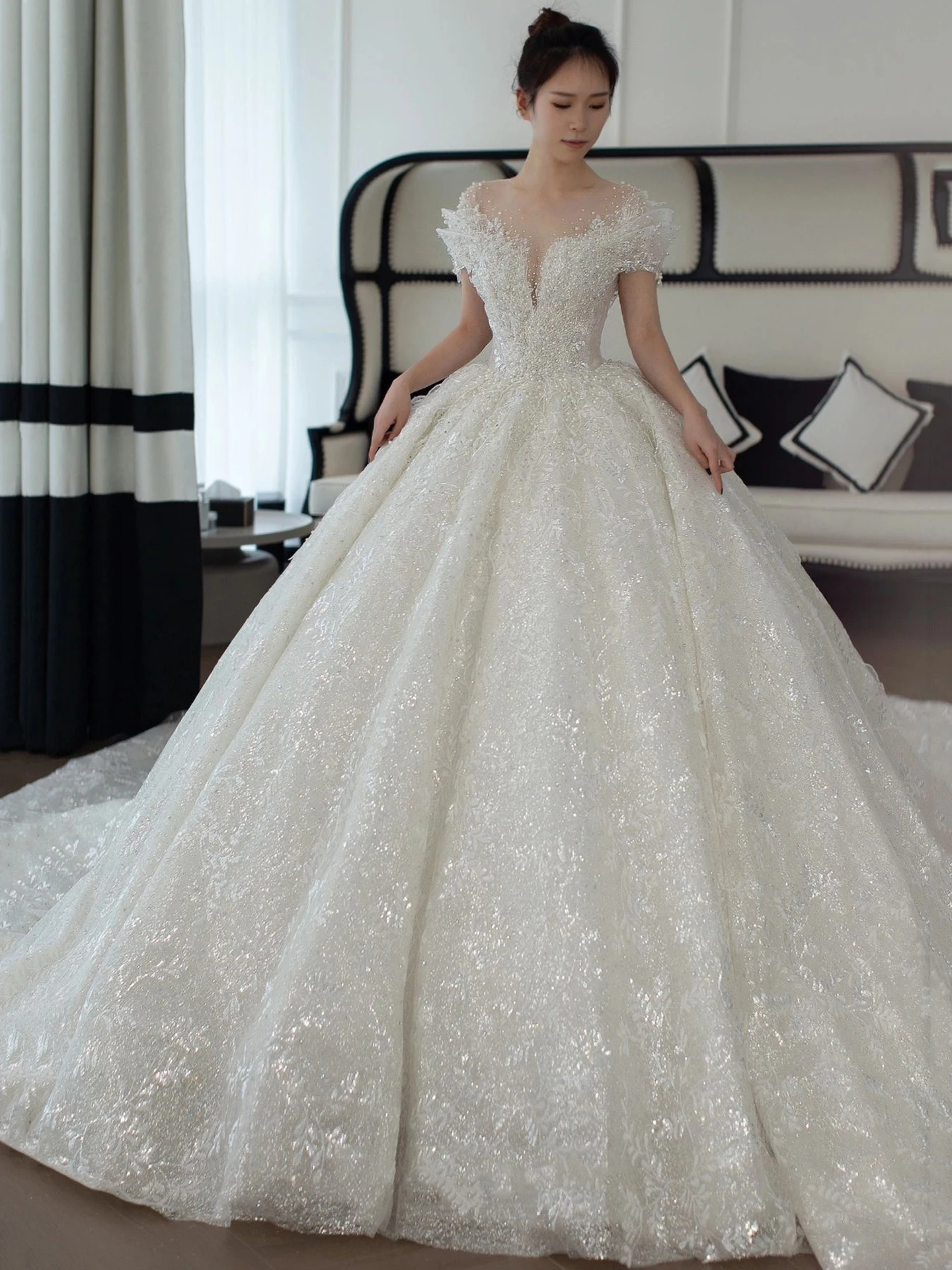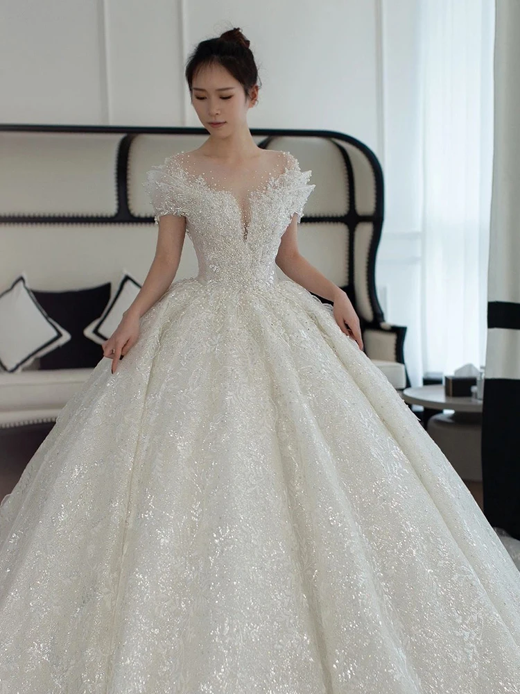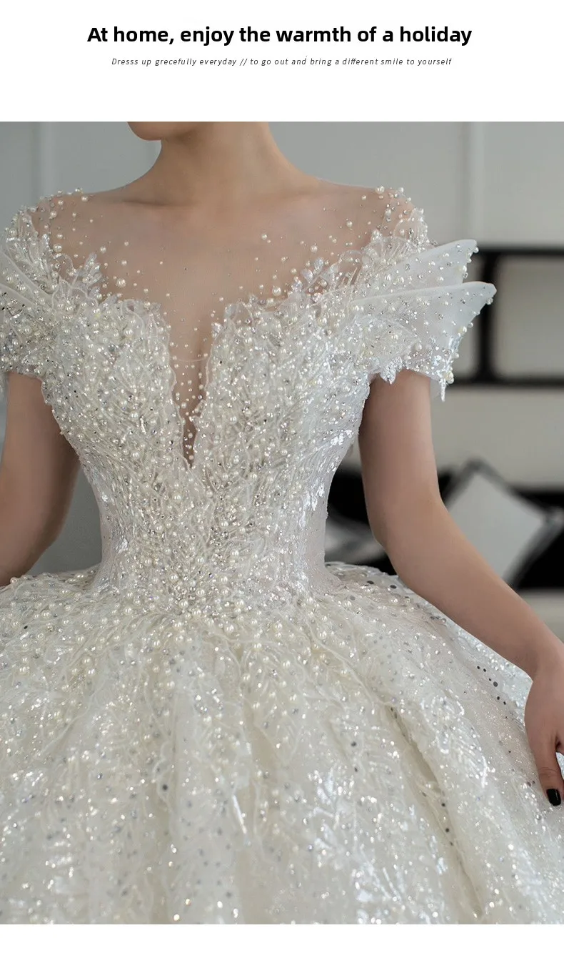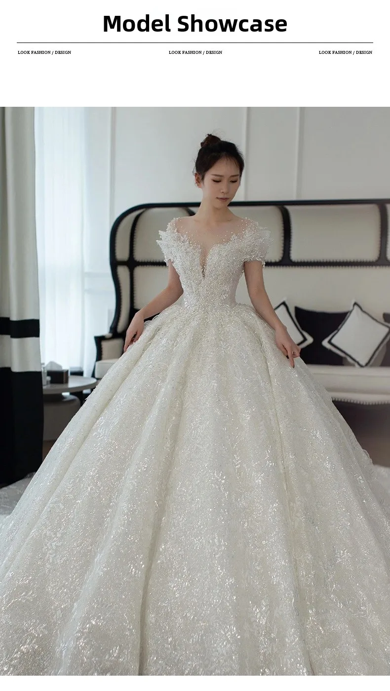 This wedding dress features a Korean style design, offering a modern and elegant look for the modern bride.